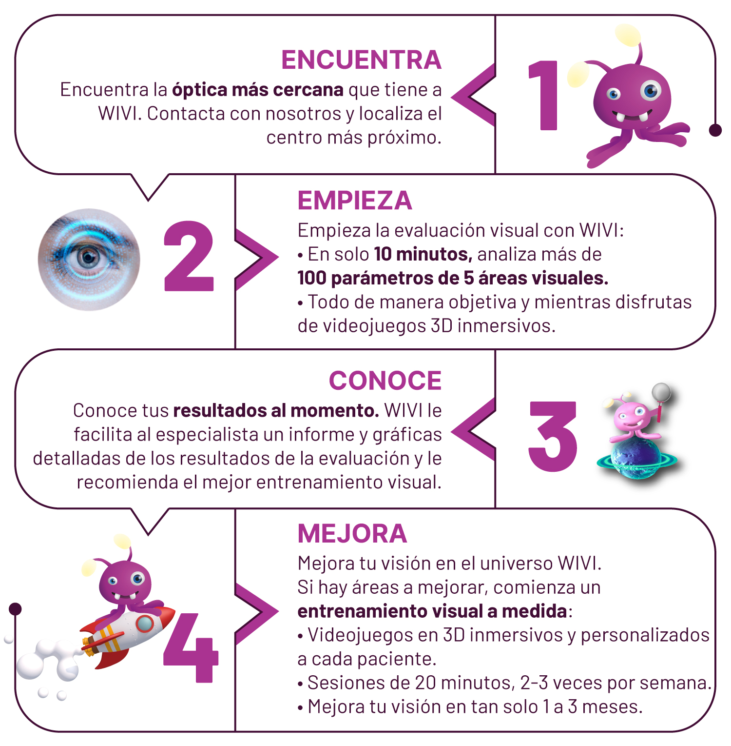 WIVI evalúa su eficacia visual en 10 minutos y le ayuda a mejorarla en menos de 3 meses con un entrenamiento visual mediante videojuegos 3D inmersivos y personalizados.
